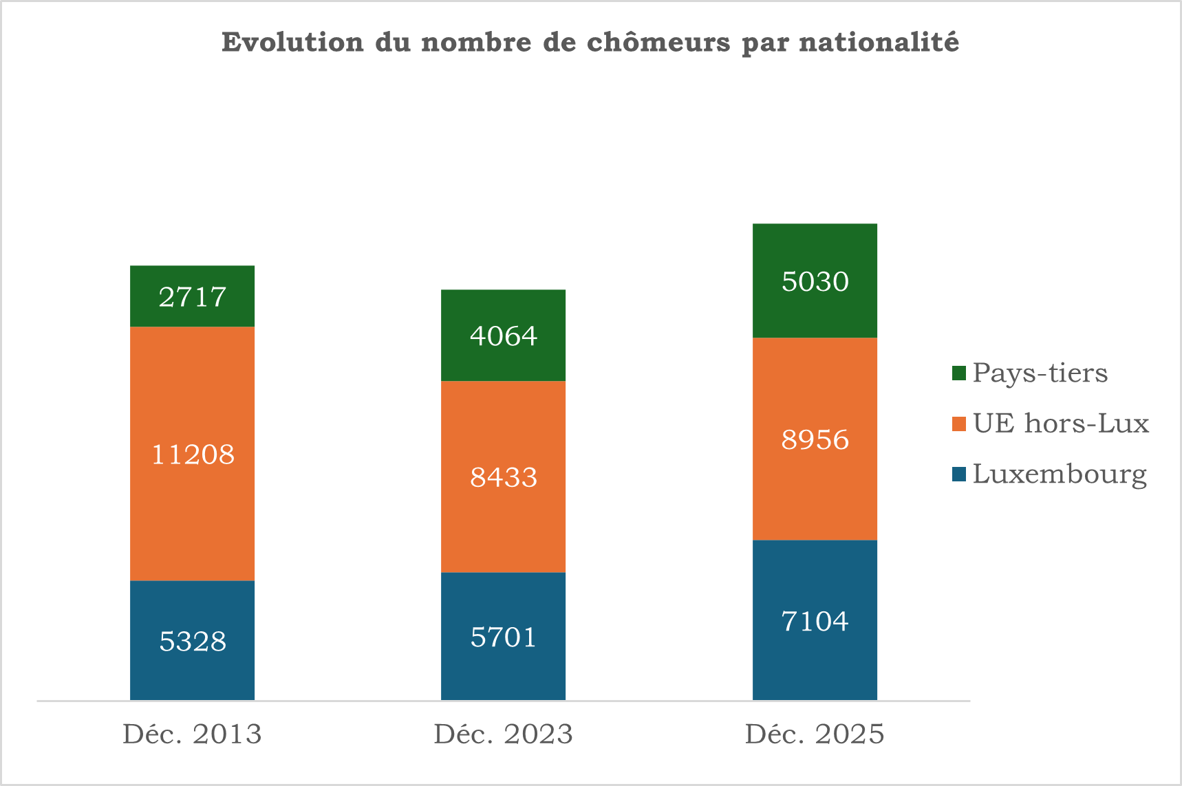 Écrit par Corentin Przybylski, le 27.01.2026 Un graphique montrant l’évolution du nombre de chomeurs au Luxembourg en décembre 2013, 2023 et 2025.